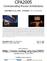 CPA2005 PostersFrom September 18 until September 21, 2005, the upcoming CPA2005 conference will be hosted by Technische Universiteit Eindhoven in Eindhoven, the Netherlands. It will take place in the university's Auditorium.