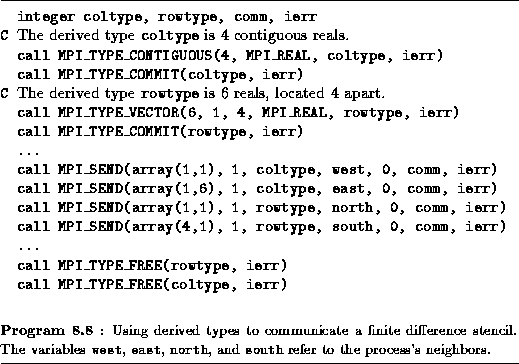 In earlier sections of this chapter, MPI routines have been used to communicate simple datatypes, such as integers and reals, or arrays of these types. The final set of MPI functions that we describe implements derived types, a mechanism allowing noncontiguous data elements to be grouped together in a message. This mechanism permits us to avoid data copy operations. Without it, the sending of a row of a two-dimensional array stored by columns would require that these noncontiguous elements be copied into a buffer before being sent.