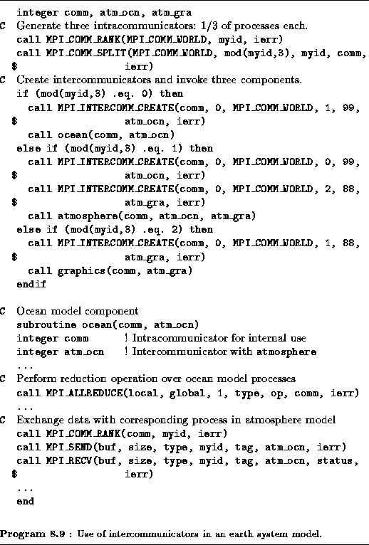 Program 8.9 implements this modular structure (Figure 8.14). The first two lines partition available processes into the three equal-sized, disjoint process groups that will be used to execute the three components. The code following the ``if'' statement establishes intercommunicators that link the atmosphere model with the ocean and graphics components, and initiates execution of the three components. Part of the ocean model code is shown also. This performs a reduction within the ocean model processes by using MPI_ALLREDUCE and the intracommunicator comm. Then, it exchanges data with corresponding processes in the atmosphere model by using the intercommunicator atm_ocn.