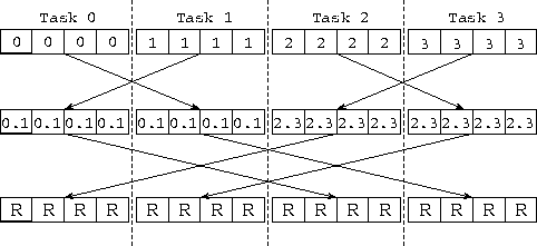 of length N=4 distributed over four tasks. In the first