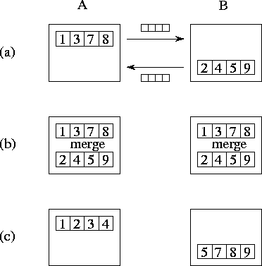 A compare-exchange operation merges two sorted sequences of length M , contained in tasks A and B . Upon completion of the operation, both tasks have M data, and all elements in task A are less than or equal to all elements in task B . As illustrated in Figure 11.5, each task sends its data to the other task. Task A identifies the M lowest elements and discards the remainder; this process requires at least M/2 and at most M comparisons. Similarly, task B identifies the M highest elements.