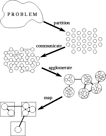 Most programming problems have several parallel solutions. The best solution may differ from that suggested by existing sequential algorithms. The design methodology that we describe is intended to foster an exploratory approach to design in which machine-independent issues such as concurrency are considered early and machine-specific aspects of design are delayed until late in the design process. This methodology structures the design process as four distinct stages: partitioning, communication, agglomeration, and mapping. (The acronym PCAM may serve as a useful reminder of this structure.) In the first two stages, we focus on concurrency and scalability and seek to discover algorithms with these qualities. In the third and fourth stages, attention shifts to locality and other performance-related issues. The four stages are illustrated in Figure 2.1 and can be summarized as follows: