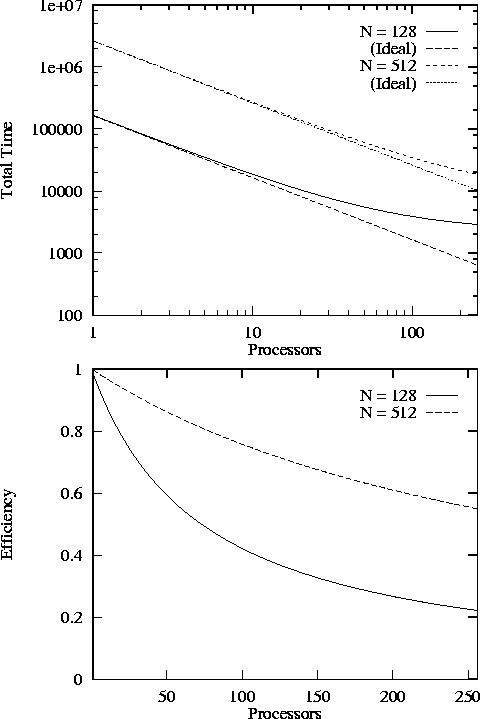 It is important to consider both E and T when evaluating scalability. While E will generally decrease monotonically with P , T may actually increase if the performance model includes a term proportional to a positive power of P . In such cases, it may not be productive to use more than some maximum number of processors for a particular problem size and choice of machine parameters.