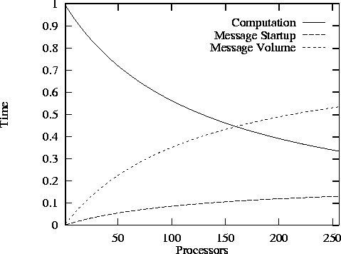 Figure 3.8: Contributions of computation, message startup, and message
