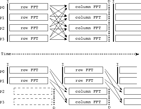 A variety of parallel algorithms are possible for the forward and inverse 2-D FFTs. A fine-grained algorithm can exploit concurrency within the 1-D FFTs performed on individual rows and columns of the input array, at the cost of considerable communication. A more coarse-grained algorithm performs independent 1-D FFTs in parallel, thereby avoiding a need for communication within the 1-D FFTs, but requiring communication when moving from a row-based to a column-based decomposition. We consider two algorithms based on the latter strategy. The first processes the input image stream sequentially, performing row FFTs and then column FFTs on each image in turn. The second algorithm pipelines the image stream, performing column FFTs for one image in parallel with the row FFTs for the next (Figure 4.5). These two algorithms are in effect sequential and parallel compositions, respectively, of code fragments that perform 1-D FFTs on the rows and columns of a two-dimensional array.