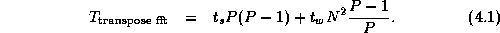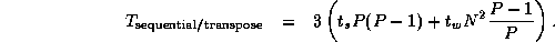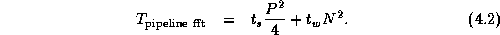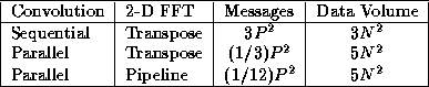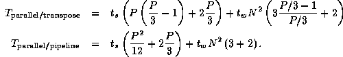 The 2-D FFTs within the parallel composition can be implemented by using either the transpose or pipeline algorithms, yielding two algorithm variants. Costs are as specified by Equations 4.1 and 4.2, except that each algorithm is executed three times, with P/3 rather than P processors involved in each execution. Combining these costs with the cost of the data movement between components, we obtain the following models.