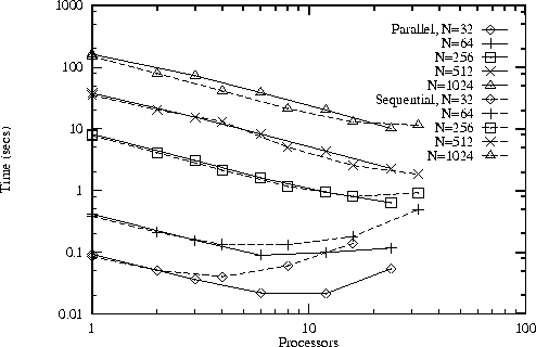 The results of this brief analysis are summarized in Table 4.1. We see that the second and third algorithms perform fewer message startups but send more data. Hence, they can be expected to be more efficient on smaller problems and larger numbers of processors. This result can be confirmed experimentally, as illustrated in Figure 4.6. A flexible parallel program might incorporate all three algorithms and select the appropriate alternative at runtime. Of course, a programming tool that supports only sequential composition will allow only the first algorithm to be used.