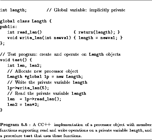 Program 5.5 uses RPCs to access a variable length located in another processor object; contrast this with the code fragment given at the beginning of this section, in which read and write operations were used for the same purpose. The communication that results is illustrated in Figure 5.2.