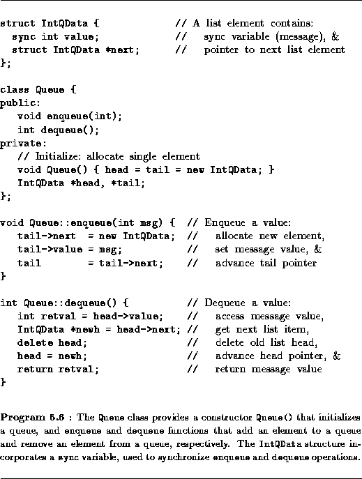 Recall that a channel is a message queue to which a sender can append a sequence of messages and from which a receiver can remove messages. The only synchronization constraint is that the receiver blocks when removing a message if the queue is empty. An obvious CC++ representation of a message queue is as a linked list, in which each entry contains a message plus a pointer to the next message. Program 5.6 takes this approach, defining a Queue class that maintains pointers to the head and tail of a message queue represented as a list of IntQData structures. The data structures manipulated by Program 5.6 are illustrated in Figure 5.4.