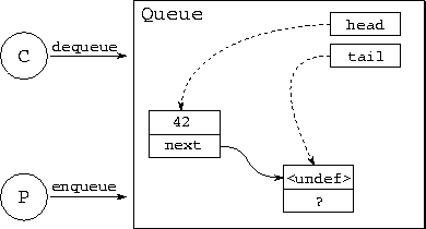 The first action performed by dequeue is to read the message value associated with the first entry in the queue. This read operation will block if the queue is empty, providing the necessary synchronization. If the queue is not empty, the dequeue function will read the queue value, delete the list element, and advance the head pointer to the next list element. Similarly, the enqueue function first allocates a new list element and links it into the queue and then sets the msg field of the current tail list element. Notice that the order in which these two operations are performed is important. If performed in the opposite order,