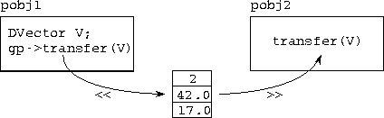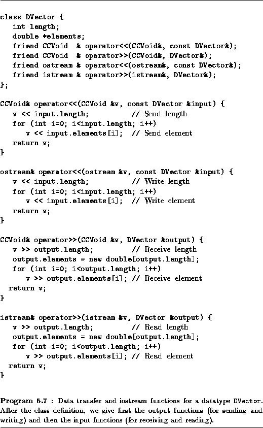 The type CCVoid is a compiler-defined type analogous to the types istream and ostream used in the iostream library. Data transfer functions are generated automatically by the CC++ compiler for simple data types, but must be constructed by the programmer for local pointers, arrays, and structures that contain local pointers. For example, Program 5.7 shows both data transfer and iostream functions for a type DVector comprising a vector of doubles. These functions send (write) the vector length followed by the vector elements, and receive (read) these values in the same order. (The C++ qualifier friend names nonmember functions that can access a class's private variables.) Having defined these data transfer functions, we can make an RPC with a DVector as an argument, as follows; the vector will be transferred correctly, as illustrated in Figure 5.5.