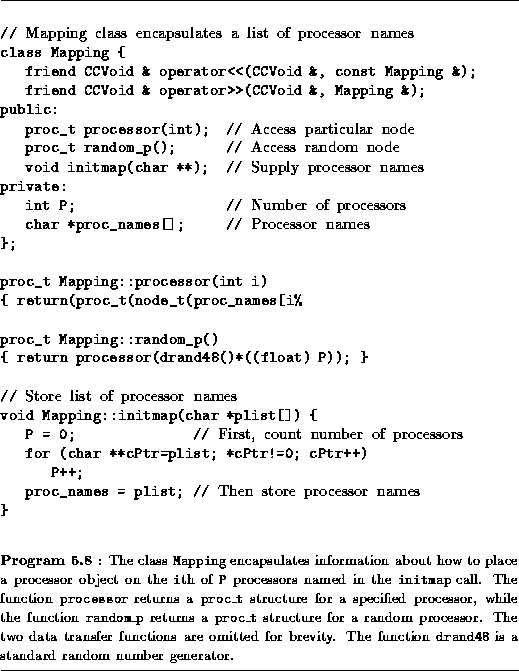 Although simple, this code represents bad programming practice, in that it embeds information about the environment in which the program is executing. A better approach is to encapsulate mapping decisions in a separate class, for example, the class Mapping defined in Program 5.8. This class encapsulates two private variables ( P and proc_names) that represent the environment in which a program is to execute. The member function initmap is used to initialize these variables. Two additional member functions, processor and random_p, return a proc_t object representing the ith processor and a randomly-selected processor, respectively. Finally, two data transfer functions (omitted for brevity) package and unpackage the node list associated with a mapping object, allowing a mapping to be passed as an argument when creating a new processor object. The use of the Mapping class is illustrated in the following example.