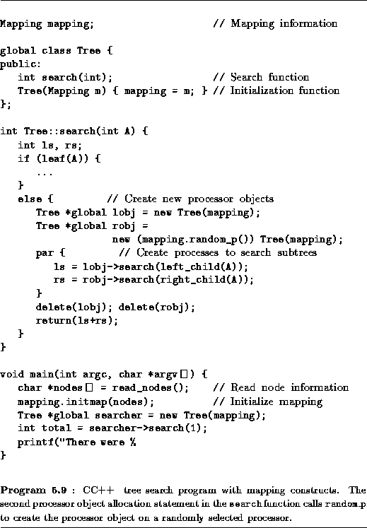 Recall that Program 5.4 explores a search tree in parallel by creating new threads to explore the subtrees rooted at each nonleaf node. Each thread executes in a new processor object. This program does not specify a mapping strategy for these processor objects. One strategy is to place each newly created processor object/thread pair on a processor selected at random. Program 5.9 uses the Mapping class of Program 5.8 to implement this behavior. There are three significant differences between this program and Program 5.4. First, a global Mapping object is defined and initialized at the beginning of main to contain the names of the processors on which the program is to execute. These names are read from a file. Second, a constructor is provided for the processor object class Tree that copies the Mapping object to each new processor object as it is created. Third, one of the processor object allocation calls in the search function is augmented with a call to random_p, which returns a proc_t structure on a randomly selected processor.