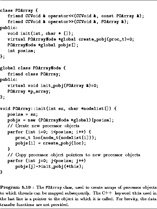 We would like to be able to use POArray to create processor objects of arbitrary type. Hence, we use the keyword virtual and the notation =0 to declare create_pobj and init_pobj to be virtual functions. This means that these functions can be defined in classes derived from the classes POArrary and POArrayNode, respectively. To create an array of virtual functions of some type T , we simply derive new classes from POArray and POArrayNode and define the functions create_pobj and init_pobj in these classes to create and initialize new processor objects of type T . This mechanism is used in the following example and in Program 5.16, both of which use POArray for mapping.