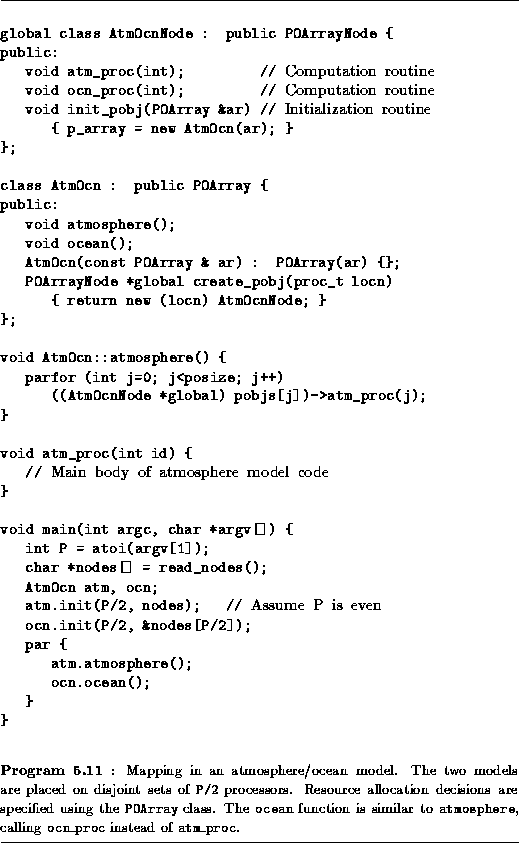 A coupled climate modeling system comprising an ocean model and an atmosphere model can be structured as a parallel composition of the two component models, in which each model executes on one half of P processors. This structure is implemented in Program 5.11. Mapping is achieved using the POArray class of Program 5.10. The class AtmOcn is derived from POArray. It extends it by defining the virtual function create_pobj used by POArray to create a processor object, as well as the functions atmosphere and ocean that implement the atmosphere and ocean models. Similarly, the processor object class AtmOcnNode is derived from POArrayNode and defines the virtual function init_pobj that initializes an ocean/atmosphere model processor object, as well as the functions atm_proc and ocn_proc that will be executed in each processor object. The init_pobj function creates a local instance of the AtmOcn object passed as an argument, hence providing each processor object with access to the other processor objects.