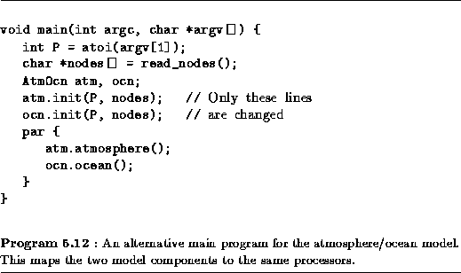 The advantage of the structure employed in Program 5.11 is that mapping decisions are specified separately from other aspects of program logic. As a result, the same program can be structured as a concurrent composition, in which the ocean and atmosphere models execute concurrently on the same processors, simply by changing the calls to init in the main program, as shown in Program 5.12.