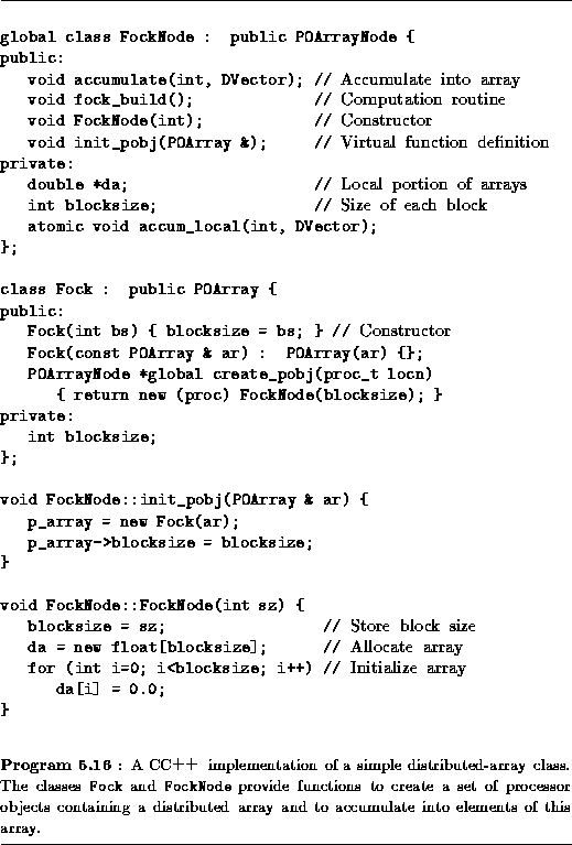 The distributed array itself is implemented by the class Fock and the processor object class FockNode, presented in Program 5.16. These are derived from the classes POArray and POArrayNode of Program 5.10, much as in the climate model of Program 5.11, and provide definitions for the virtual functions create_pobj and init_pobj. The derived classes defined in Program 5.16 are used to create the array of processor objects within which computation will occur. The data structures that implement the distributed array are allocated within these same processor objects, with each of the posize processor objects being assigned blocksize array elements. Notice how the initialization function for FockNode allocates and initializes the elements of the distributed array.