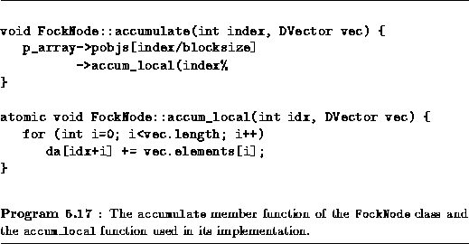 For brevity, Program 5.16 implements only an accumulate operation. This function is defined in Program 5.17. Notice how it issues an RPC to a remote processor object (number index/blocksize) requesting an operation on a specified sequence of values. The function invoked by the RPC ( accum_local) is an atomic function; this ensures that two concurrent accumulate operations do not produce meaningless results.