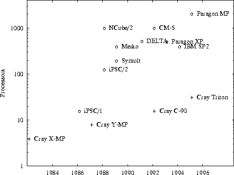 Computer designers use a variety of techniques to overcome these limitations on single computer performance, including pipelining (different stages of several instructions execute concurrently) and multiple function units (several multipliers, adders, etc., are controlled by a single instruction stream). Increasingly, designers are incorporating multiple ``computers,'' each with its own processor, memory, and associated interconnection logic. This approach is facilitated by advances in VLSI technology that continue to decrease the number of components required to implement a computer. As the cost of a computer is (very approximately) proportional to the number of components that it contains, increased integration also increases the number of processors that can be included in a computer for a particular cost. The result is continued growth in processor counts (Figure 1.3).