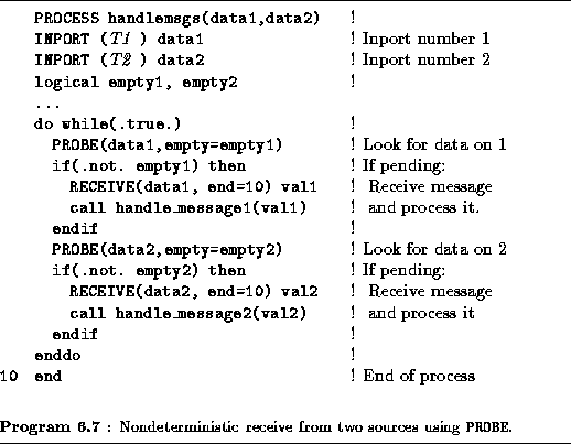 The PROBE statement can also be used to receive data that arrive in a nondeterministic fashion from several sources. For example, Program 6.7 handles messages of types T1 and T2 received on ports data1 and data2, respectively. A disadvantage of this program is that if no messages are pending, it consumes resources by repeatedly probing the two channels. This busy waiting strategy is acceptable if no other computation can be performed on the processor on which this process is executing. In general, however, it is preferable to use a different technique. If T1=T2 , we can introduce a merger to combine the two message streams, as follows. The handlemsgs2 process then performs receive operations on its single inport, blocking until data are available.
