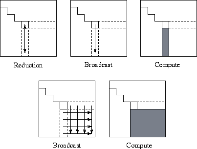 Studying this algorithm, we see that it has two interesting attributes. First, there is little locality in communication beyond the fact that broadcasts and reductions are performed in rows and columns. Second, computation tends to be clustered: in each step, much of the computation is performed by tasks in a single row and column (before the FORALL) and in the bottom right-hand corner (the FORALL). These attributes can be exploited when developing data distribution directives to complete the parallel algorithm.