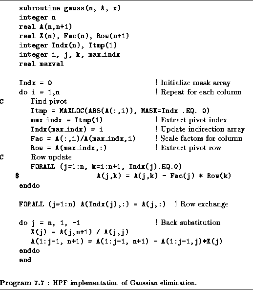 Program 7.7 is an HPF implementation of this algorithm. For efficiency, this program maintains the vector b in the N+1 th column of the array A . The first do-loop implements Gaussian elimination. The MAXLOC intrinsic is used to identify the pivot row. Rather than performing an explicit swap with row i , an indirection array called indx is used to keep track of the actual indices of selected rows. This array is updated once the pivot is identified. The next statement computes the N scale factors; notice that the computation can be performed with a single array assignment. Finally, the FORALL statement performs the subtractions. The mask ensures that the subtraction is performed only for rows that have not been previously selected as pivots ( Indx(j).EQ.0). Once the do-loop is complete, a second FORALL is used to reorganize the matrix into upper triangular form.