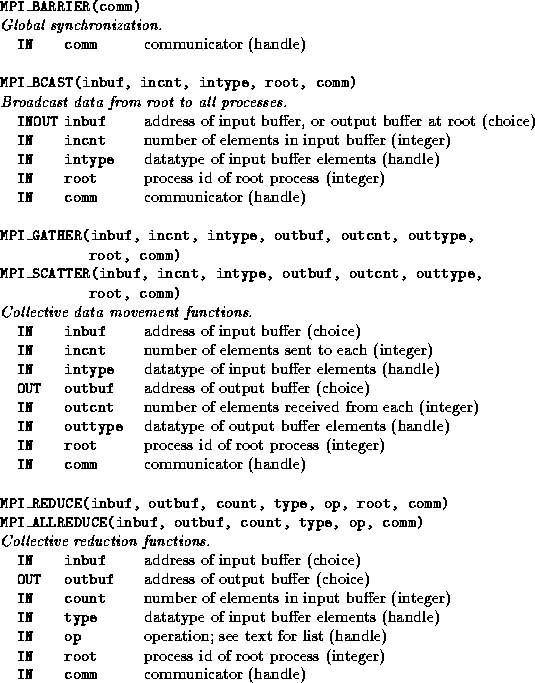 These operations are summarized in Figure 8.2. All are executed collectively, meaning that each process in a process group calls the communication routine with the same parameters.