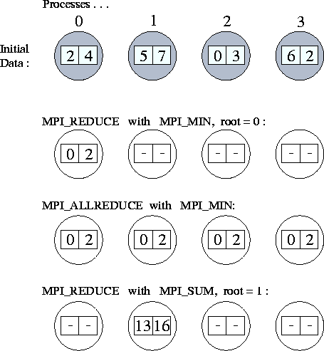 The functions MPI_REDUCE and MPI_ALLREDUCE implement reduction operations. They combine the values provided in the input buffer of each process, using a specified operation op, and return the combined value either to the output buffer of the single root process (in the case of MPI_REDUCE) or to the output buffer of all processes ( MPI_ALLREDUCE). The operation is applied pointwise to each of the count values provided by each process. All operations return count values with the same datatype as the operands. Valid operations include maximum and minimum ( MPI_MAX and MPI_MIN); sum and product ( MPI_SUM and MPI_PROD); logical and, or, and exclusive or ( MPI_LAND, MPI_LOR, and MPI_LXOR); and bitwise and, or, and exclusive or ( MPI_BAND, MPI_BOR, and MPI_BXOR).